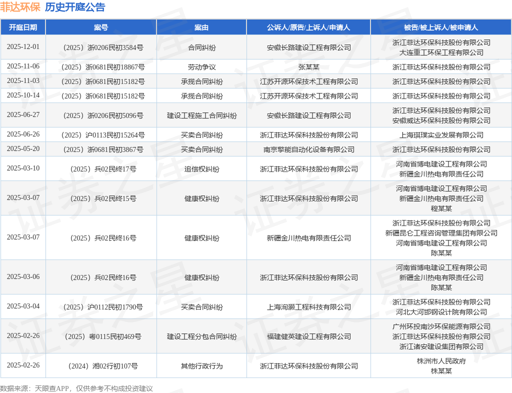 案号:(2025)浙0206民初3584号根据统计,近一年内以浙江菲达环保科技股份有限公司为当事人的历史开庭公告有14则,其中案由为“买卖合同纠纷”的公告以3则居首,其次为“健康权纠纷”有3则,“承揽合同纠纷”有2则。历史开庭公告如下: