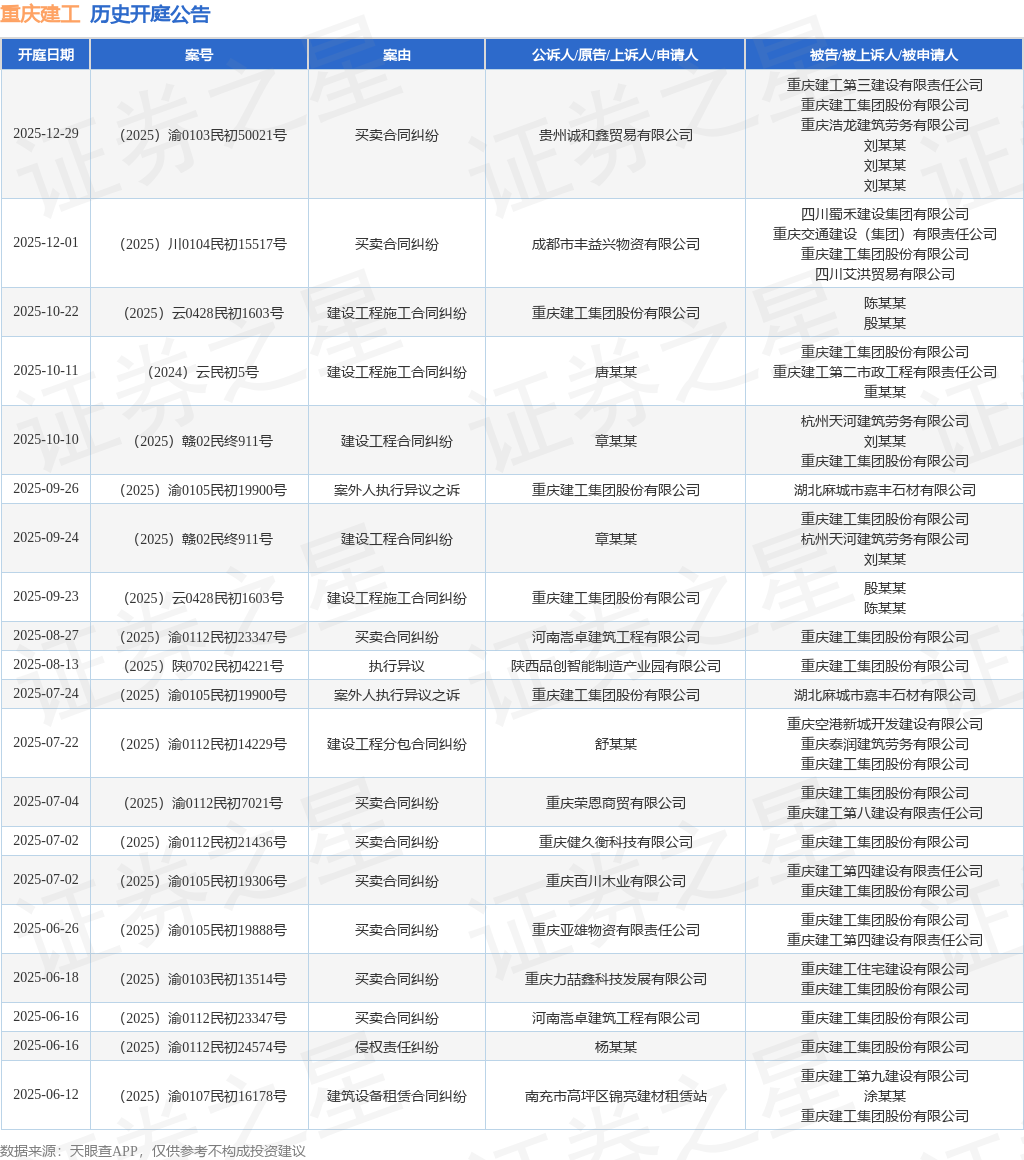案号:(2025)川0104民初15517号根据统计,近一年内以重庆建工集团股份有限公司为当事人的历史开庭公告有399则,其中案由为“买卖合同纠纷”的公告以140则居首,其次为“劳务合同纠纷”有62则,“建设工程施工合同纠纷”有39则。历史开庭公告(前20条)如下: