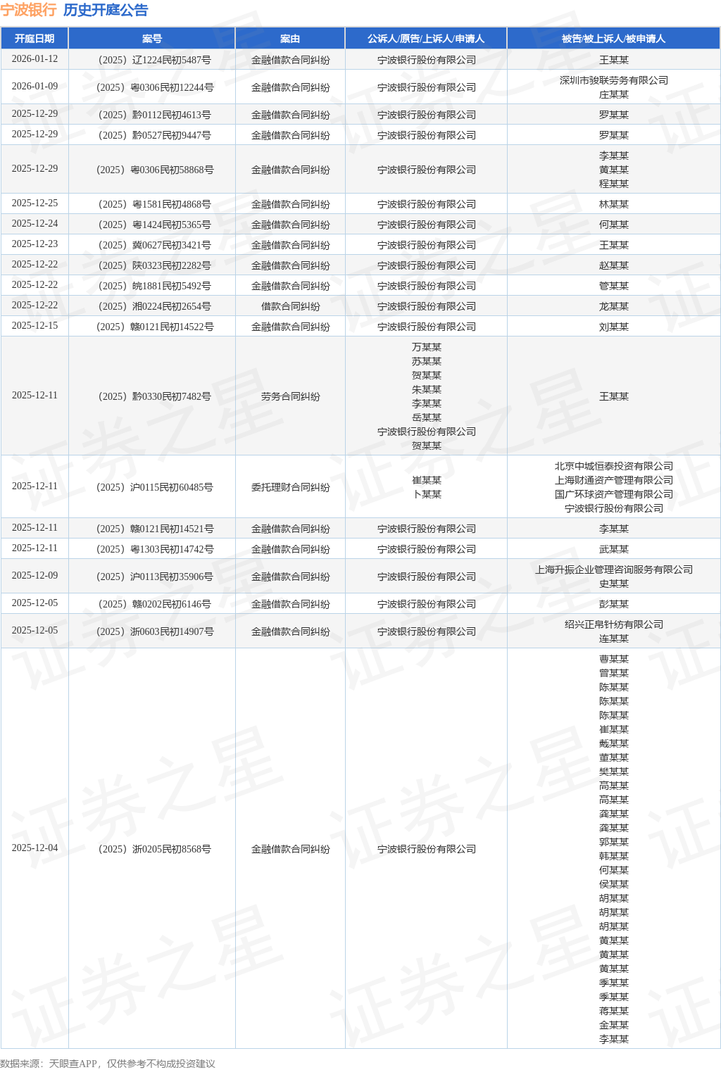 案号:(2025)浙0282民初25629号根据统计,近一年内以宁波银行股份有限公司为当事人的历史开庭公告有1710则,其中案由为“金融借款合同纠纷”的公告以1515则居首,其次为“借款”有116则,“借款合同纠纷”有43则。历史开庭公告(前20条)如下: