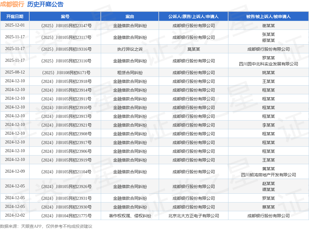 证券之星消息,根据天眼查APP显示,近日公布了一则成都银行股份有限公司作为原告/上诉人的开庭公告,详细内容如下: