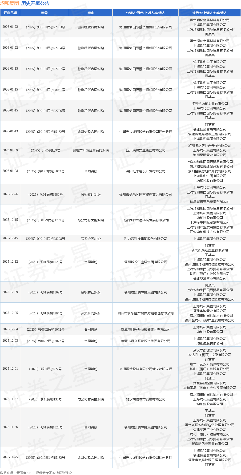 案号:(2025)鄂01民初222号根据统计,近一年内以上海均和集团有限公司为当事人的历史开庭公告有96则,其中案由为“买卖合同纠纷”的公告以54则居首,其次为“合同纠纷”有11则,“股权转让纠纷”有9则。历史开庭公告(前20条)如下: