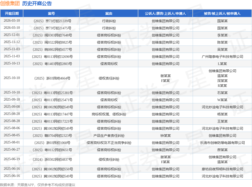案号:(2025)闽0303民初7648号根据统计,近一年内以创维集团有限公司为当事人的历史开庭公告有50则,其中案由为“侵害商标权纠纷”的公告以36则居首,其次为“商标权权属、侵权纠纷”有4则,“侵害商标权”有2则。历史开庭公告(前20条)如下: