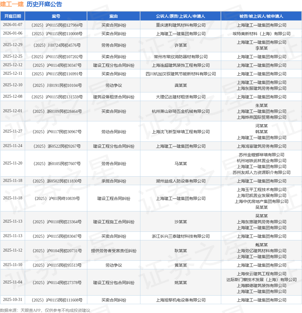 案号:(2025)浙0109民初28464号根据统计,近一年内以上海建工一建集团有限公司为当事人的历史开庭公告有307则,其中案由为“买卖合同纠纷”的公告以74则居首,其次为“建设工程施工合同纠纷”有43则,“劳动争议”有37则。历史开庭公告(前20条)如下: