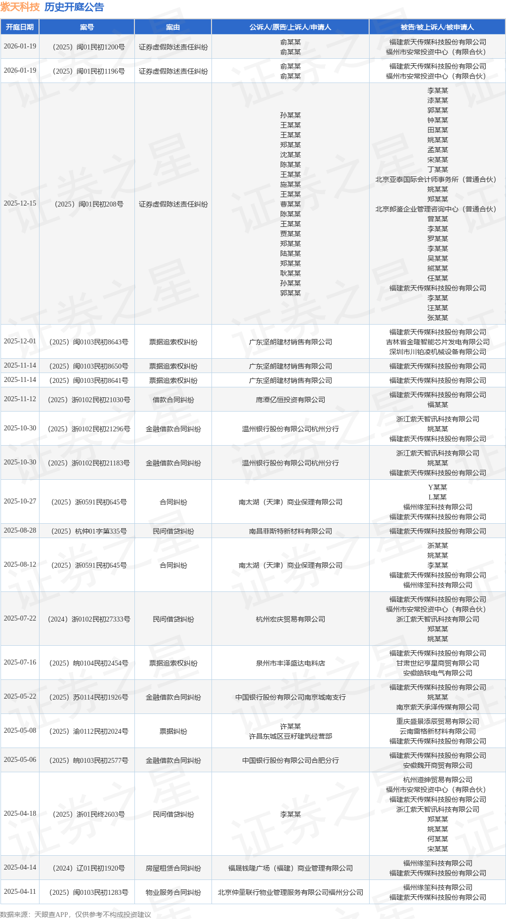 案号:(2025)闽0103民初8643号根据统计,近一年内以福建紫天传媒科技股份有限公司为当事人的历史开庭公告有32则,其中案由为“民间借贷纠纷”的公告以8则居首,其次为“票据追索权纠纷”有4则,“证券虚假陈述责任纠纷”有4则。历史开庭公告(前20条)如下: