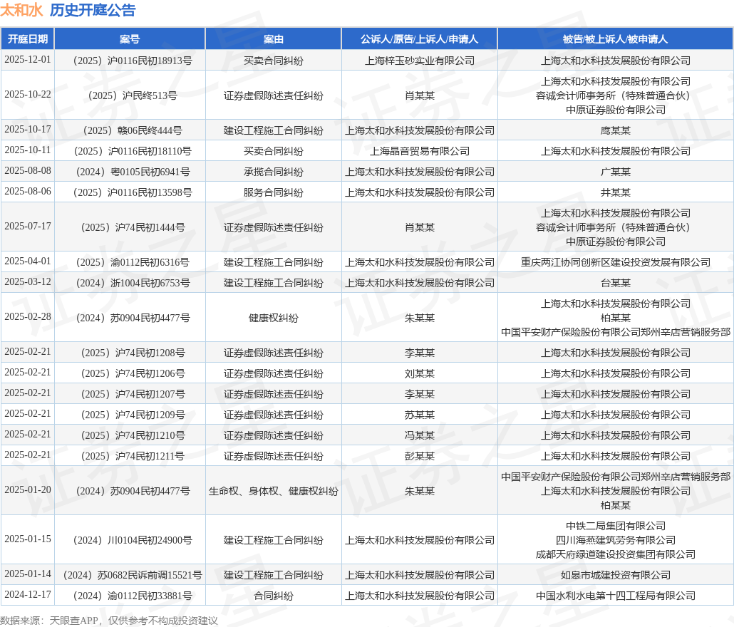 案号:(2025)沪0116民初18913号根据统计,近一年内以上海太和水科技发展股份有限公司为当事人的历史开庭公告有25则,其中案由为“证券虚假陈述责任纠纷”的公告以8则居首,其次为“建设工程施工合同纠纷”有5则,“买卖合同纠纷”有2则。历史开庭公告(前20条)如下: