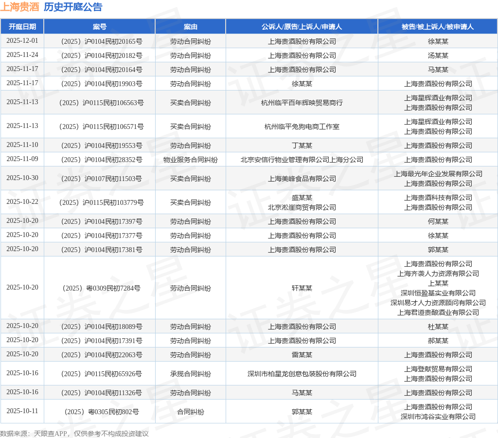 案号:(2025)沪0104民初20165号根据统计,近一年内以上海贵酒股份有限公司为当事人的历史开庭公告有89则,其中案由为“劳动合同纠纷”的公告以36则居首,其次为“合同纠纷”有13则,“买卖合同纠纷”有8则。历史开庭公告(前20条)如下: