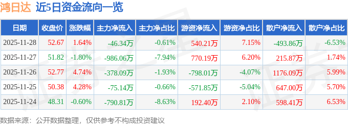 证券之星消息,截至2025年11月28日收盘,鸿日达(301285)报收于52.67元,上涨1.64%,换手率1.84%,成交量1.44万手,成交额7559.61万元。