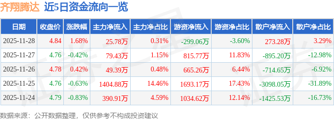 证券之星消息,截至2025年11月28日收盘,齐翔腾达(002408)报收于4.84元,上涨1.68%,换手率0.63%,成交量17.22万手,成交额8309.22万元。