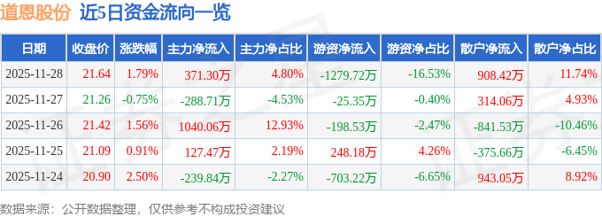 证券之星消息,截至2025年11月28日收盘,道恩股份(002838)报收于21.64元,上涨1.79%,换手率0.86%,成交量3.62万手,成交额7740.19万元。