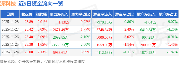 证券之星消息,截至2025年11月28日收盘,深科技(000021)报收于23.89元,上涨2.01%,换手率3.07%,成交量48.24万手,成交额11.43亿元。