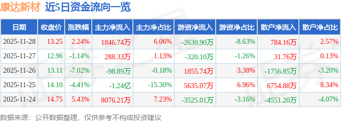 证券之星消息,截至2025年11月28日收盘,康达新材(002669)报收于13.25元,上涨2.24%,换手率7.65%,成交量23.09万手,成交额3.05亿元。