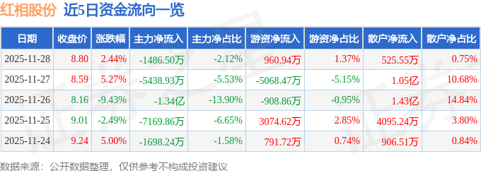 证券之星消息,截至2025年11月28日收盘,红相股份(300427)报收于8.8元,上涨2.44%,换手率16.14%,成交量81.18万手,成交额7.0亿元。