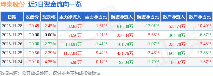 证券之星消息,截至2025年11月28日收盘,坤泰股份(001260)报收于20.49元,上涨2.45%,换手率7.97%,成交量2.53万手,成交额5131.75万元。