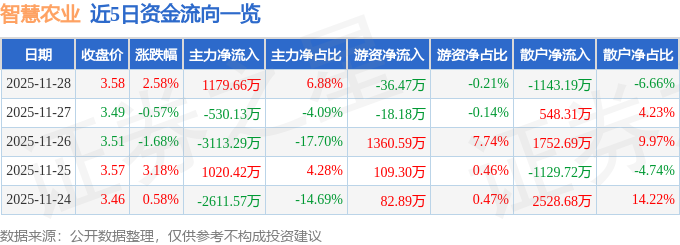 证券之星消息,截至2025年11月28日收盘,智慧农业(000816)报收于3.58元,上涨2.58%,换手率3.37%,成交量48.45万手,成交额1.72亿元。