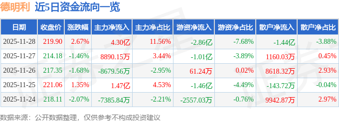 证券之星消息,截至2025年11月28日收盘,德明利(001309)报收于219.9元,上涨2.67%,换手率10.66%,成交量17.14万手,成交额37.24亿元。