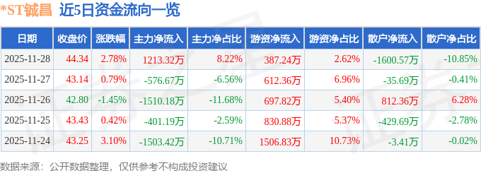 证券之星消息,截至2025年11月28日收盘,*ST铖昌(001270)报收于44.34元,上涨2.78%,换手率1.65%,成交量3.35万手,成交额1.48亿元。