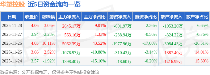 证券之星消息,截至2025年11月28日收盘,华塑控股(000509)报收于4.06元,上涨3.05%,换手率6.88%,成交量73.8万手,成交额2.94亿元。