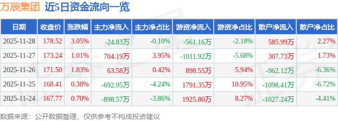 证券之星消息,截至2025年11月28日收盘,万辰集团(300972)报收于178.52元,上涨3.05%,换手率0.87%,成交量1.45万手,成交额2.58亿元。