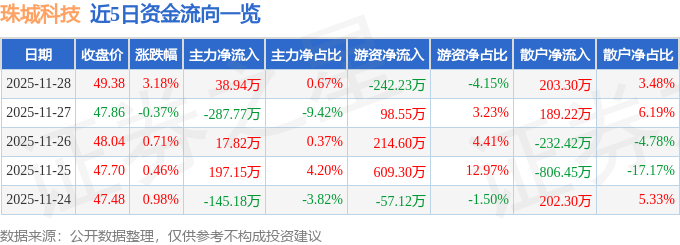 证券之星消息,截至2025年11月28日收盘,珠城科技(301280)报收于49.38元,上涨3.18%,换手率3.18%,成交量1.2万手,成交额5834.46万元。