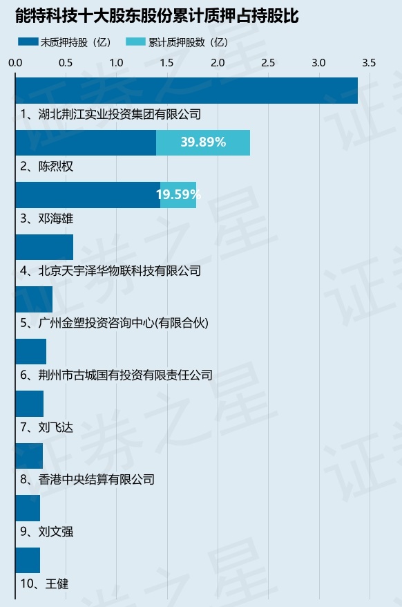 截止本公告日,股东陈烈权已累计质押股份9260.0万股,占其持股总数的39.89%,股东邓海雄已累计质押股份3500.0万股,占其持股总数的19.59%。本次质押后能特科技十大股东的累计质押股份占持股比例(占持股比例的计算以公司最新一期财务报表公布的十大股东的持股总数为基准)见下图: