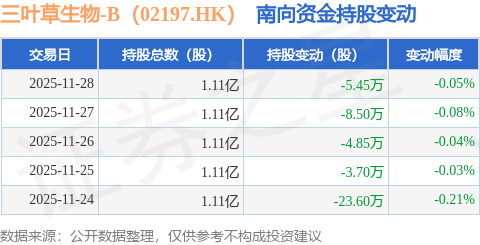 证券之星消息,11月28日南向资金减持5.45万股三叶草生物-B(02197.HK)。近5个交易日中,获南向资金减持的有5天,累计净减持46.1万股。近20个交易日中,获南向资金减持的有20天,累计净减持410.9万股。截至目前,南向资金持有三叶草生物-B(02197.HK)1.11亿股,占公司已发行普通股的8.51%。