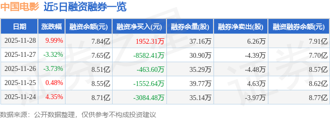 中国电影融资融券信息显示,融资方面,当日融资买入2.47亿元,融资偿还2.28亿元,融资净买入1952.31万元。融券方面,融券卖出7.29万股,融券偿还1.03万股,融券余量37.16万股,融券余额642.5万元。融资融券余额7.91亿元。