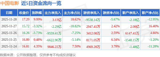 证券之星消息,截至2025年11月28日收盘,中国电影(600977)报收于17.29元,上涨9.99%,涨停,换手率5.42%,成交量101.26万手,成交额16.81亿元。