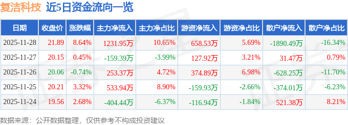 证券之星消息,截至2025年11月28日收盘,复洁科技(688335)报收于21.89元,上涨8.64%,换手率3.67%,成交量5.44万手,成交额1.16亿元。