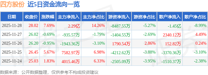 证券之星消息,截至2025年11月28日收盘,四方股份(601126)报收于28.02元,上涨7.69%,换手率7.01%,成交量57.87万手,成交额16.09亿元。