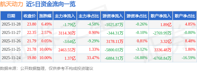 证券之星消息,截至2025年11月28日收盘,航天动力(600343)报收于23.8元,上涨6.49%,换手率26.62%,成交量169.9万手,成交额39.09亿元。