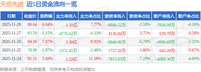 11月28日的资金流向数据方面,主力资金净流入1.31亿元,占总成交额7.77%,游资资金净流出6046.52万元,占总成交额3.59%,散户资金净流出7036.99万元,占总成交额4.18%。