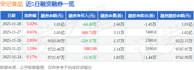 证券之星消息,截至2025年11月28日收盘,安记食品(603696)报收于12.96元,上涨5.02%,换手率11.07%,成交量26.03万手,成交额3.31亿元。