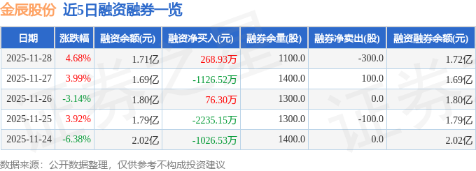 金辰股份融资融券信息显示,融资方面,当日融资买入2397.12万元,融资偿还2128.19万元,融资净买入268.93万元。融券方面,融券卖出0.0股,融券偿还300.0股,融券余量1100.0股,融券余额3.84万元。融资融券余额1.72亿元。