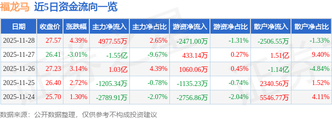 证券之星消息,截至2025年11月28日收盘,福龙马(603686)报收于27.57元,上涨4.39%,换手率16.66%,成交量69.22万手,成交额18.82亿元。