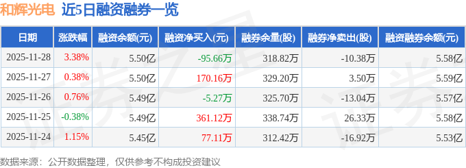 和辉光电融资融券信息显示,融资方面,当日融资买入1885.22万元,融资偿还1980.89万元,融资净偿还95.66万元。融券方面,融券卖出11.13万股,融券偿还21.51万股,融券余量318.82万股,融券余额876.76万元。融资融券余额5.58亿元。