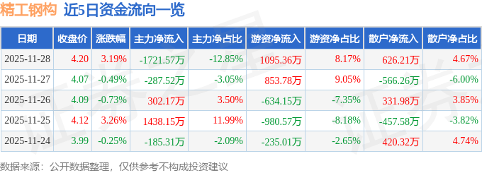 证券之星消息,截至2025年11月28日收盘,精工钢构(600496)报收于4.2元,上涨3.19%,换手率1.63%,成交量32.38万手,成交额1.34亿元。