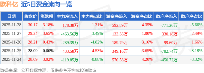 证券之星消息,截至2025年11月28日收盘,欧科亿(688308)报收于30.17元,上涨3.18%,换手率2.9%,成交量4.61万手,成交额1.36亿元。