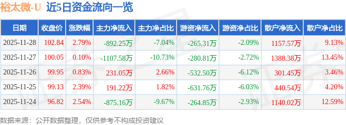 证券之星消息,截至2025年11月28日收盘,裕太微(688515)报收于102.84元,上涨2.79%,换手率2.49%,成交量1.24万手,成交额1.27亿元。