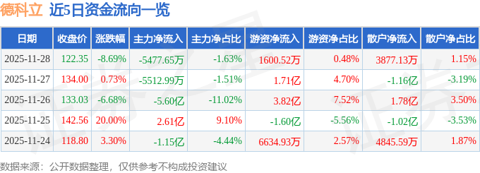 证券之星消息,截至2025年11月28日收盘,德科立(688205)报收于122.35元,下跌8.69%,换手率17.02%,成交量26.94万手,成交额33.64亿元。