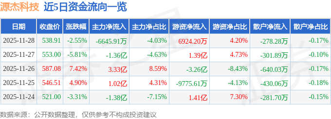 证券之星消息,截至2025年11月28日收盘,源杰科技(688498)报收于538.91元,下跌2.55%,换手率5.03%,成交量3.03万手,成交额16.47亿元。