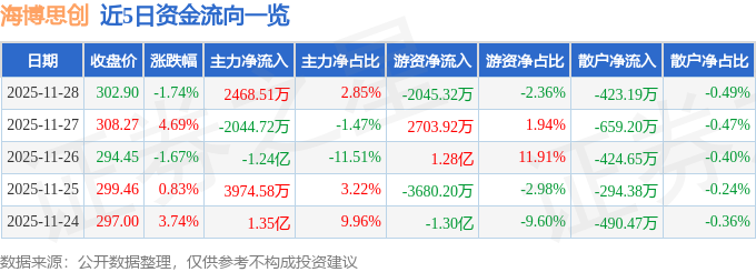 证券之星消息,截至2025年11月28日收盘,海博思创(688411)报收于302.9元,下跌1.74%,换手率7.45%,成交量2.83万手,成交额8.67亿元。