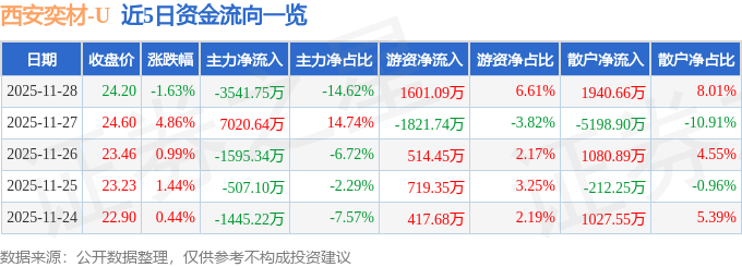 11月28日的资金流向数据方面,主力资金净流出3541.75万元,占总成交额14.62%,游资资金净流入1601.09万元,占总成交额6.61%,散户资金净流入1940.66万元,占总成交额8.01%。