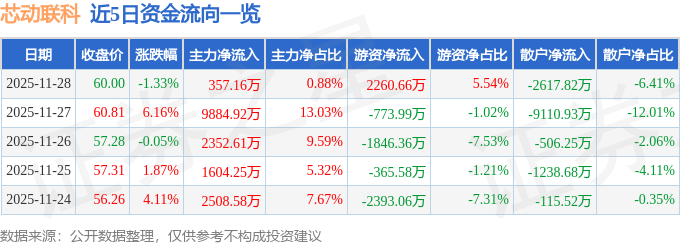 证券之星消息,截至2025年11月28日收盘,芯动联科(688582)报收于60.0元,下跌1.33%,换手率2.73%,成交量6.83万手,成交额4.08亿元。