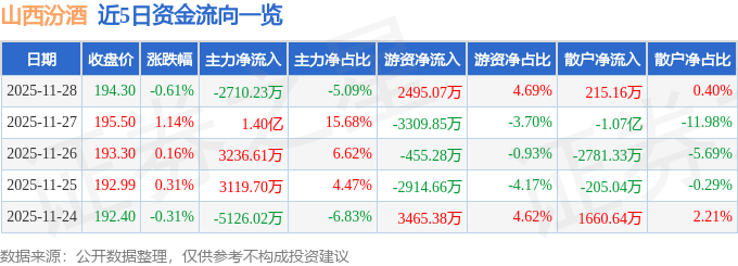 证券之星消息,截至2025年11月28日收盘,山西汾酒(600809)报收于194.3元,下跌0.61%,换手率0.22%,成交量2.74万手,成交额5.32亿元。