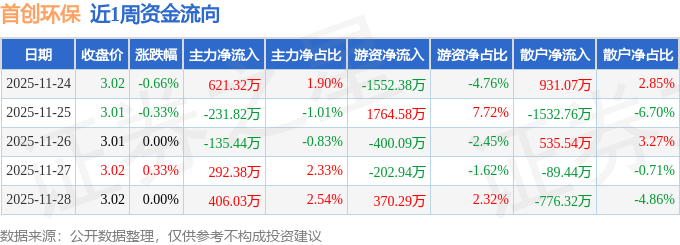 资金流向数据方面,本周首创环保主力资金合计净流入952.46万元,游资资金合计净流出20.54万元,散户资金合计净流出931.92万元。本周资金流向一览见下表:
