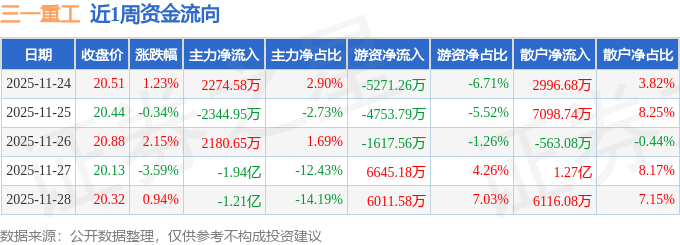 资金流向数据方面,本周三一重工主力资金合计净流出2.94亿元,游资资金合计净流入1014.15万元,散户资金合计净流入2.84亿元。本周资金流向一览见下表: