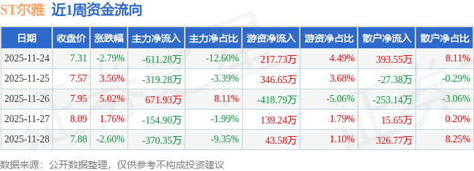 资金流向数据方面,本周ST尔雅主力资金合计净流出783.87万元,游资资金合计净流入328.42万元,散户资金合计净流入455.46万元。本周资金流向一览见下表: