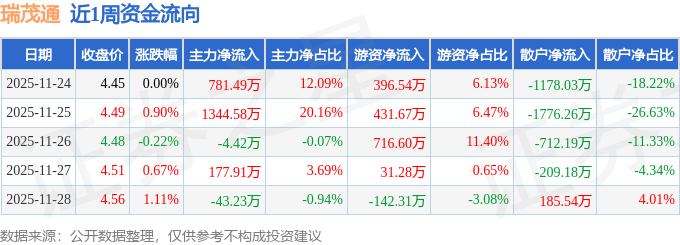 资金流向数据方面,本周瑞茂通主力资金合计净流入2256.33万元,游资资金合计净流入1433.78万元,散户资金合计净流出3690.11万元。本周资金流向一览见下表: