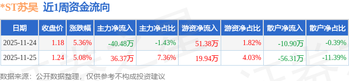 资金流向数据方面,本周*ST苏吴主力资金合计净流出4.11万元,游资资金合计净流入71.32万元,散户资金合计净流出67.21万元。本周资金流向一览见下表:
