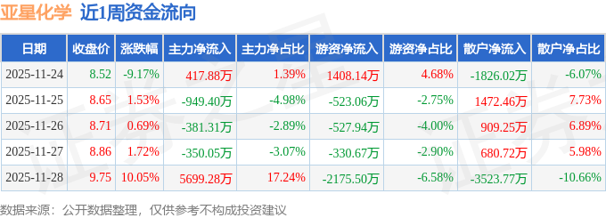 资金流向数据方面,本周亚星化学主力资金合计净流入4436.39万元,游资资金合计净流出2149.03万元,散户资金合计净流出2287.36万元。本周资金流向一览见下表: